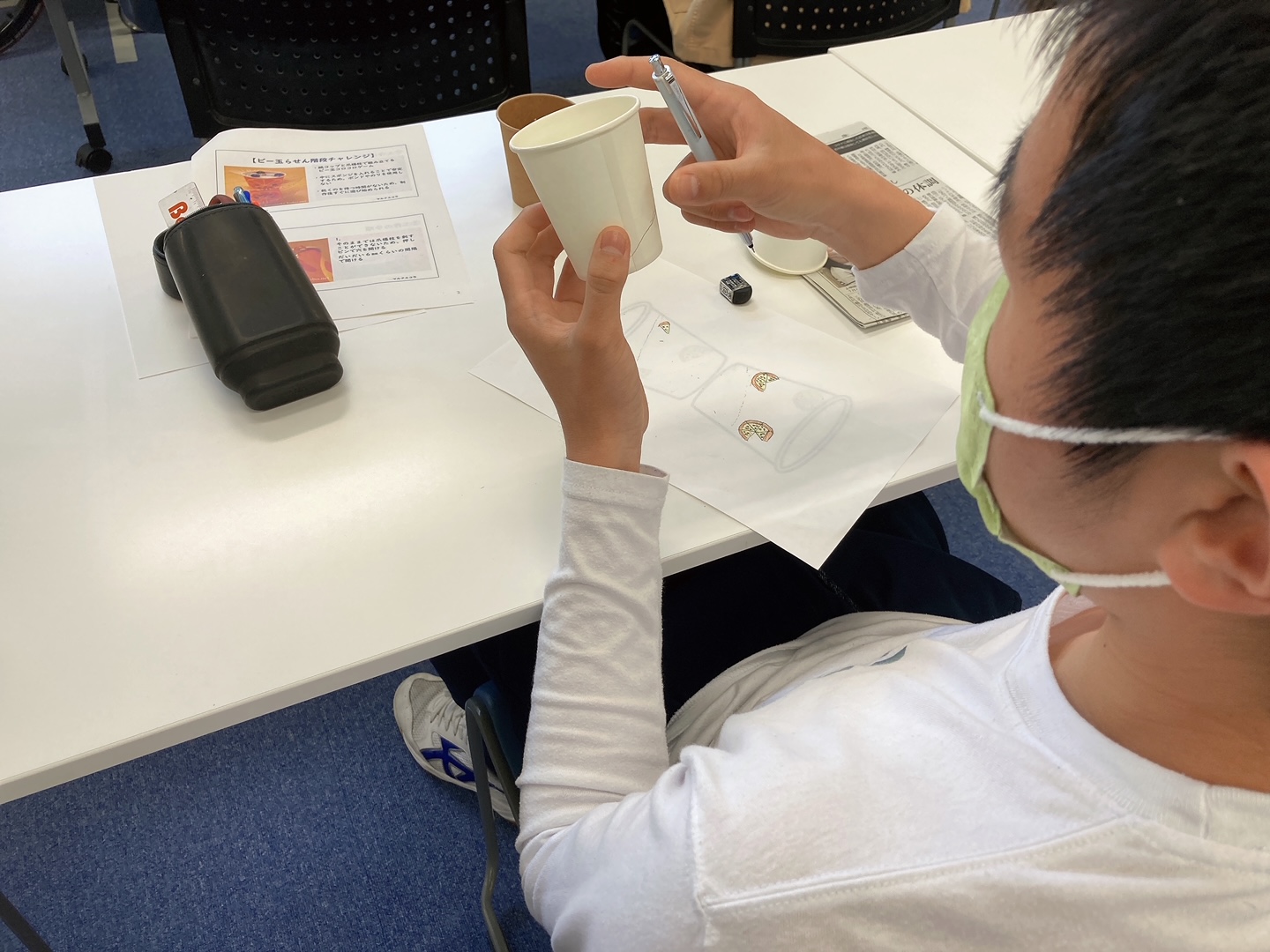紙コップで螺旋上につまようじを指してビー玉を転がせるように