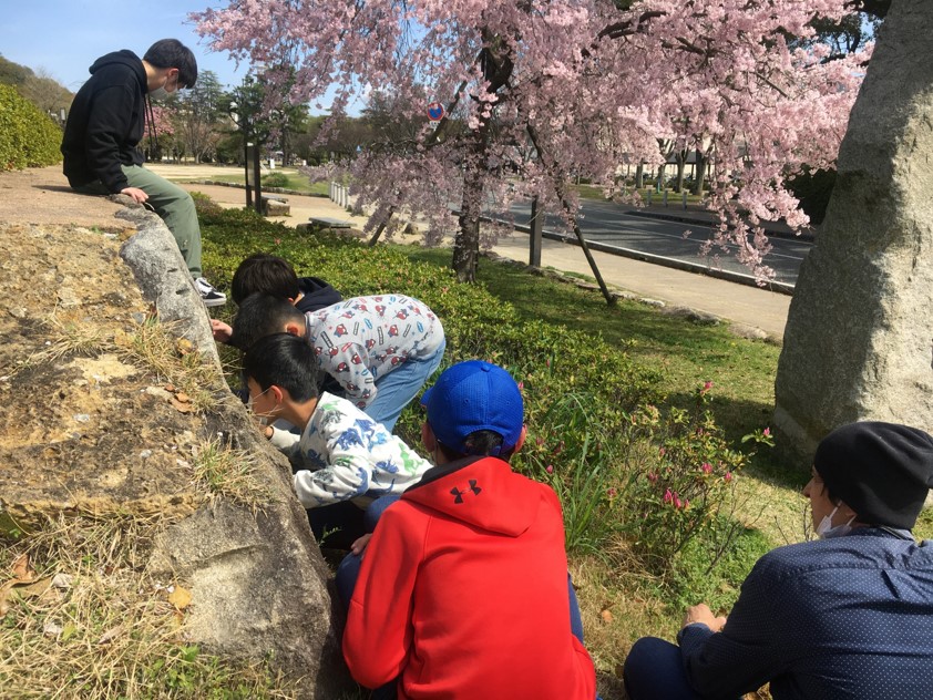 男子軍団でとかげを探しています。ひょこっと顔は見えるのですが、すぐに岩の隙間に逃げてしまい、