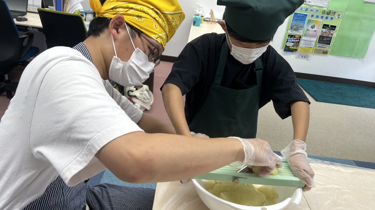 「じゃがいも硬い!」と皮むきやあく抜きに苦戦されながらも班の生徒さんと協力して調理を進めることができました😊