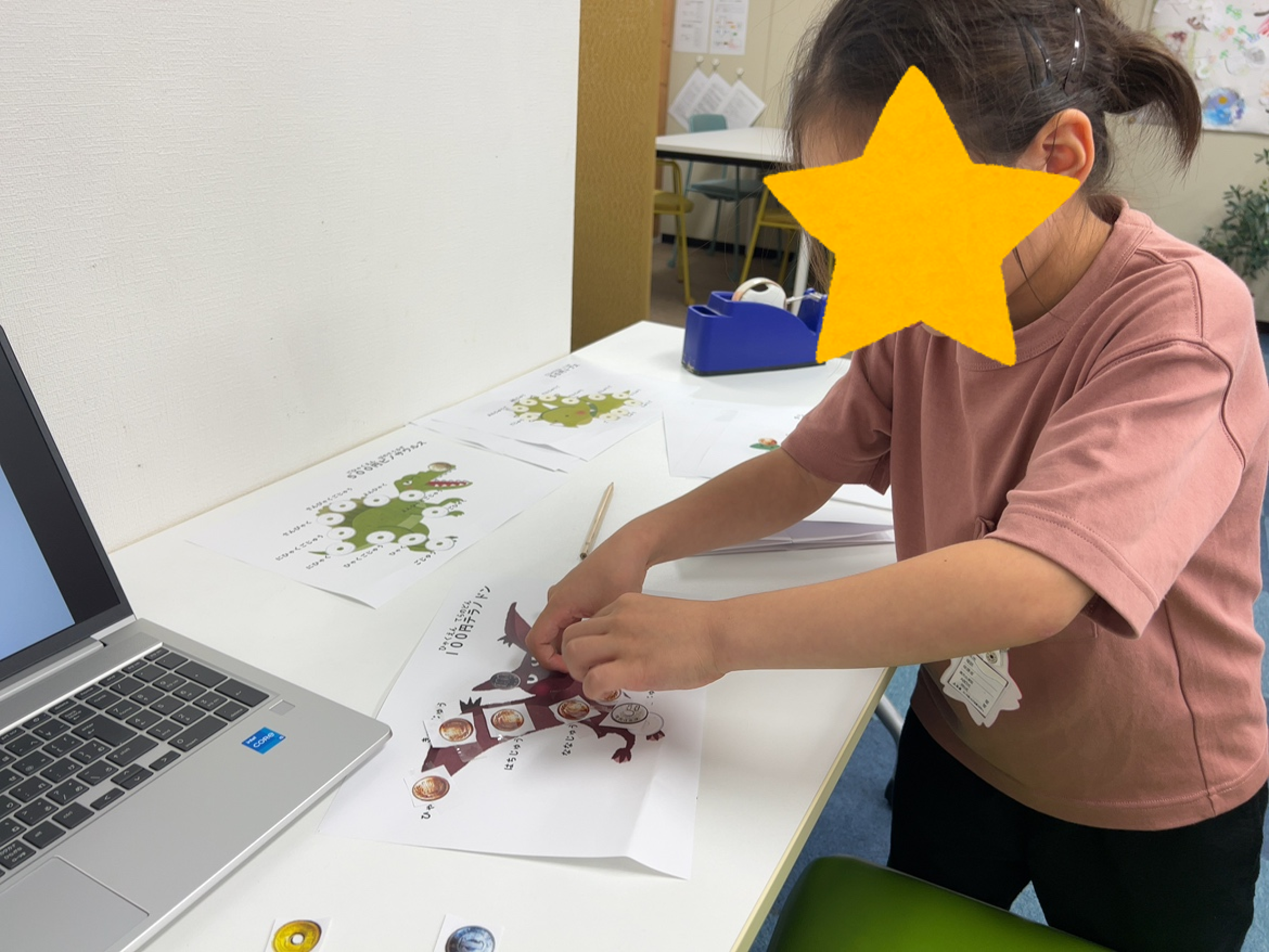 低学年の生徒さんは、個別に大好きな恐竜をモチーフにしたお金ザウルスに餌(お金)をあげました(笑)