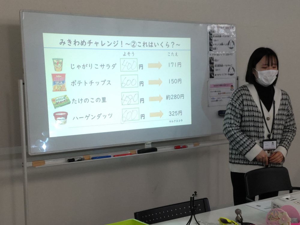 まずは、生徒さんにとって身近な商品から値段を予想していきます。