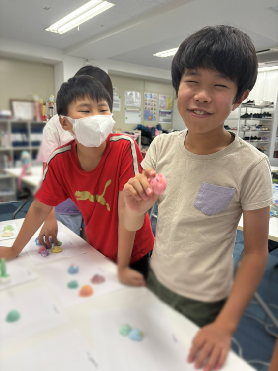 粘土に絵の具を少しずつ混ぜて、こねこね・・・