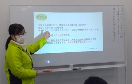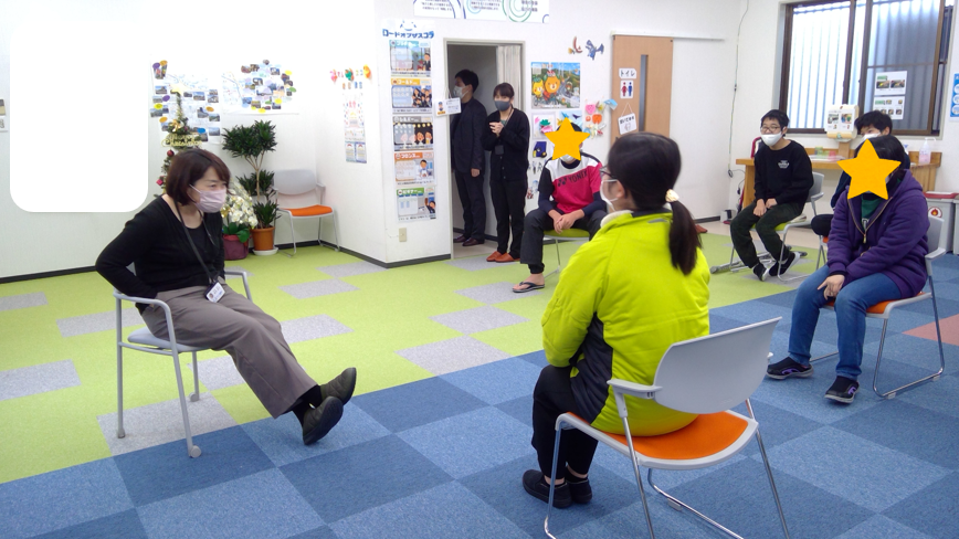 ポケットに手を入れて椅子の背もたれにもたれ首で会釈をする、「えっと~…。」「…かな。」という言葉で話すスタッフに対し、生徒さんから様々の気づきがあがりました🙋‍♂️