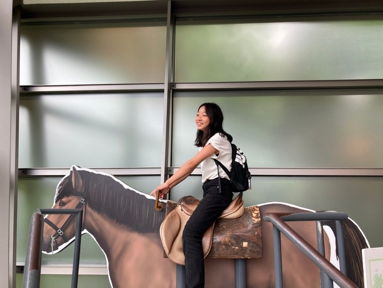 騎馬隊が乗っていた馬の模型に乗ることができるコーナーでは、「目線高い!」「意外と乗り心地いい!」と大喜び!🐎