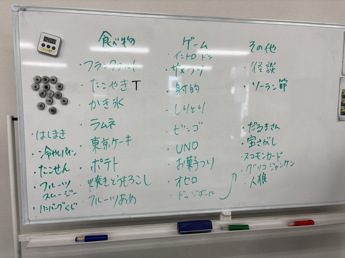 始めは遠慮し合っていた生徒さんも、「フランクフルト!」「たこ焼き🐙」「射的🔫」とどんどん意見が出てきました!