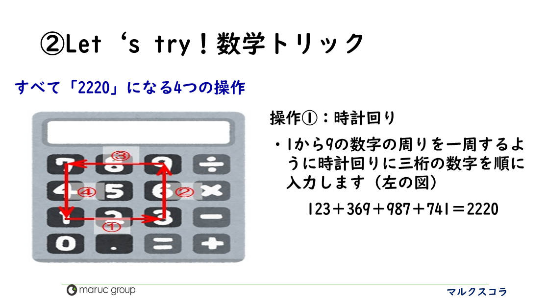 5を除く数字を3桁ずつ時計周りで足していくと、答えが「2220」に!