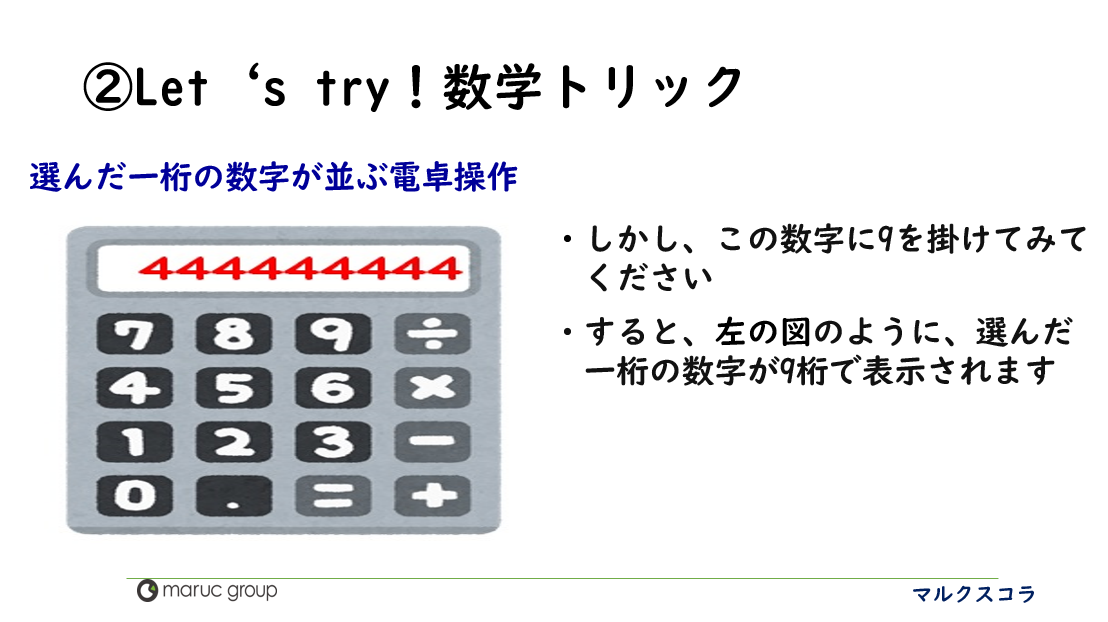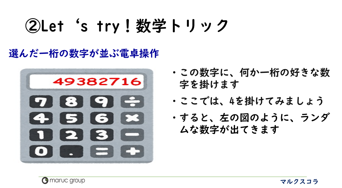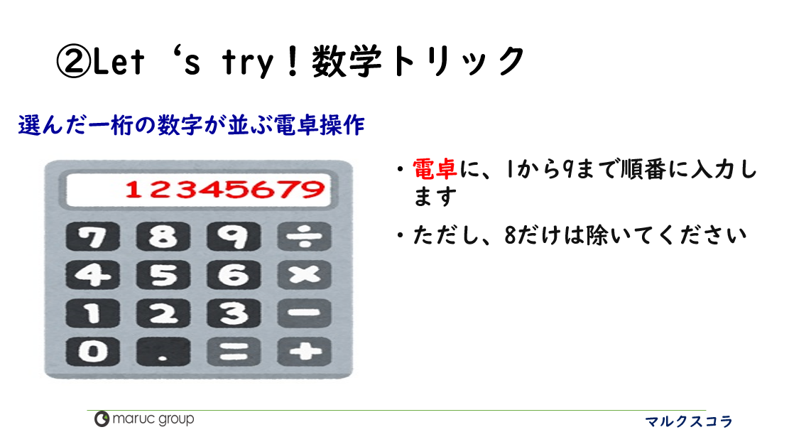 ②答えに対して、更に×9をすると①で選んだ好きな数字が並んで表示されます