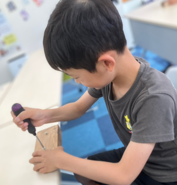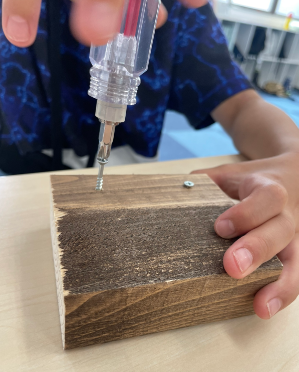 本棚を作り始める前に、ドライバーを使って「ねじを締める・緩める」の練習を行いました!